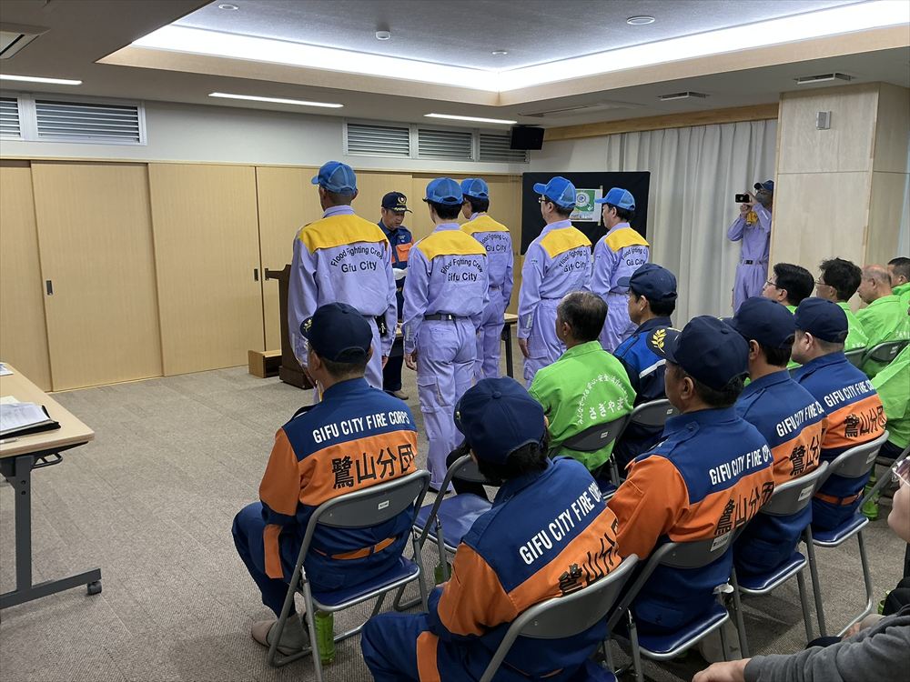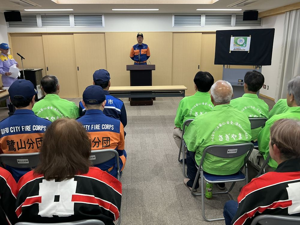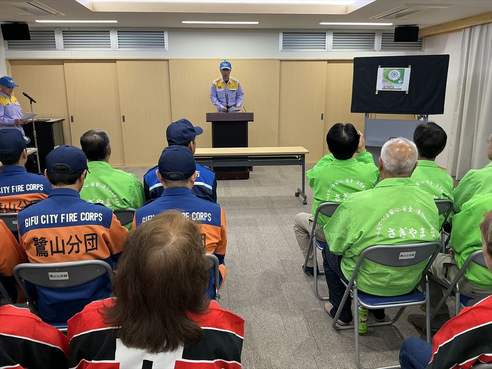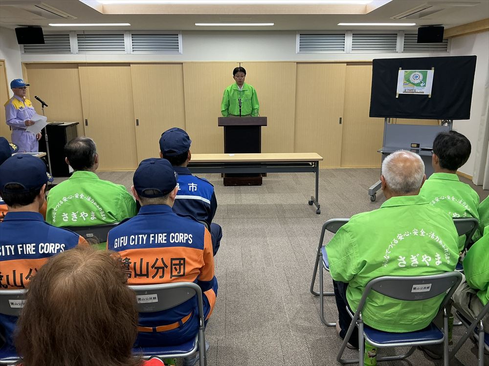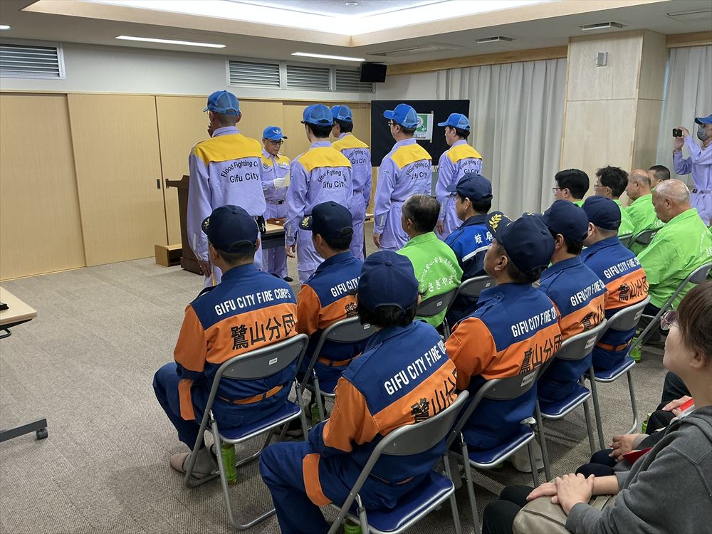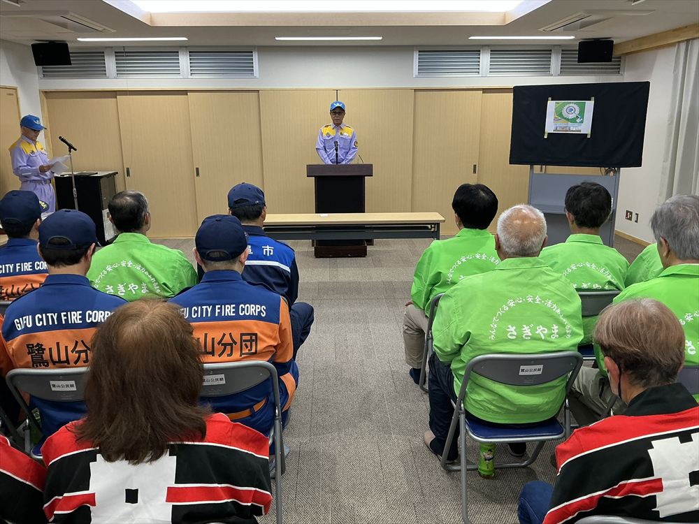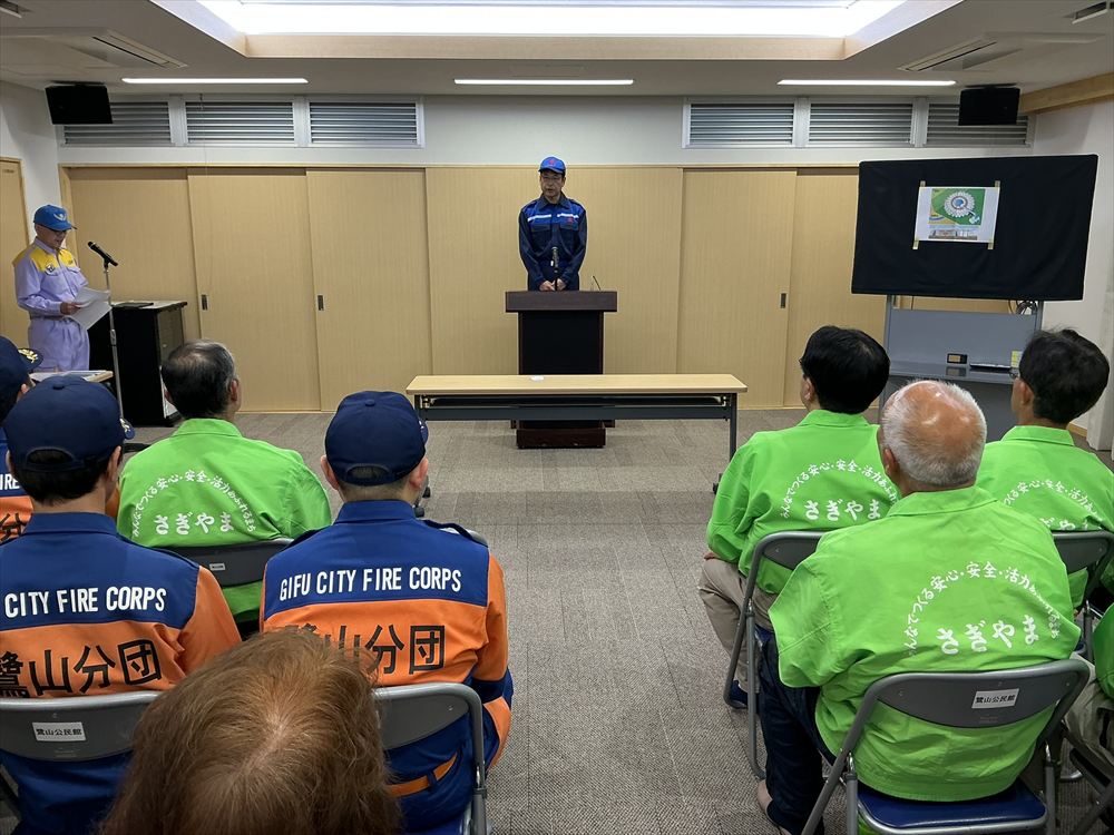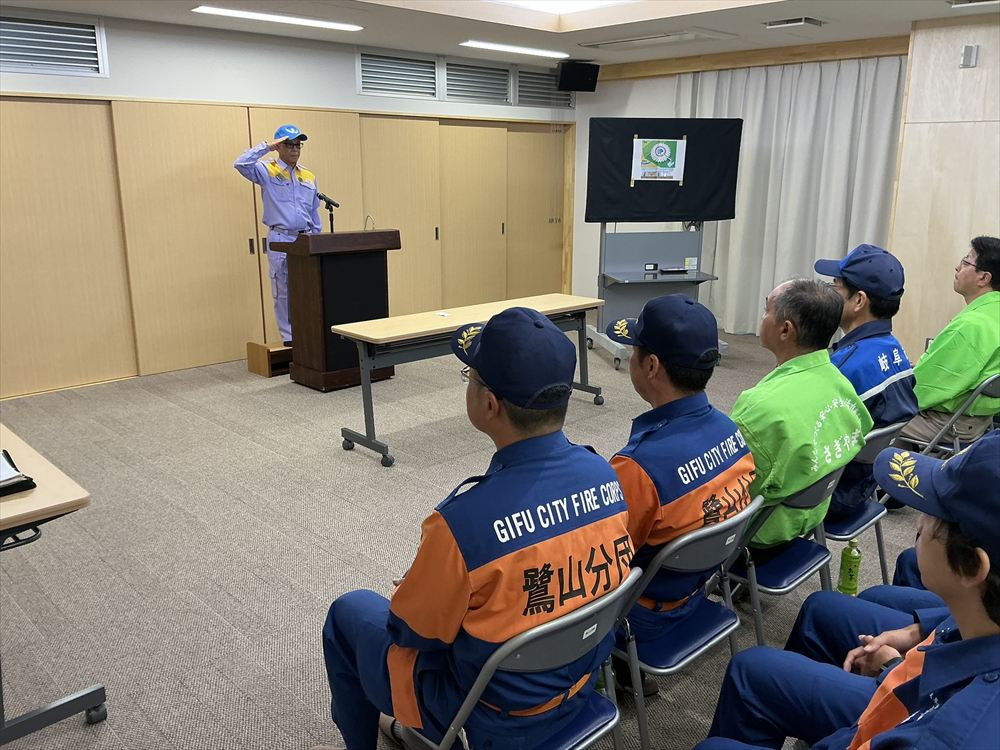 鷺山自治会連合会、岐阜市北消防団鷺山分団、鷺山女性防火クラブの役員の皆さんが来賓として参列され、代表して鷺山自治会連合会 水野 吉近 会長並びに岐阜市 危機管理部 水防対策課から挨拶を頂きました。