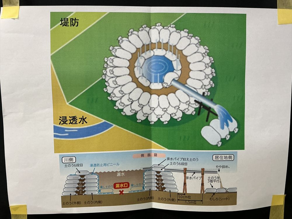 山田 護 副団長からは、令和7年度に取り組む釜段工の内容について説明がありました。この工法は、堤防の下を川の水の圧力等によって水道ができて、堤防内に浸透水が漏れ出てきた時に対応するための工法であることが説明されました。実際に、長良川堤防でも使用されることがある非常に実践的な工法であることが分かりました。