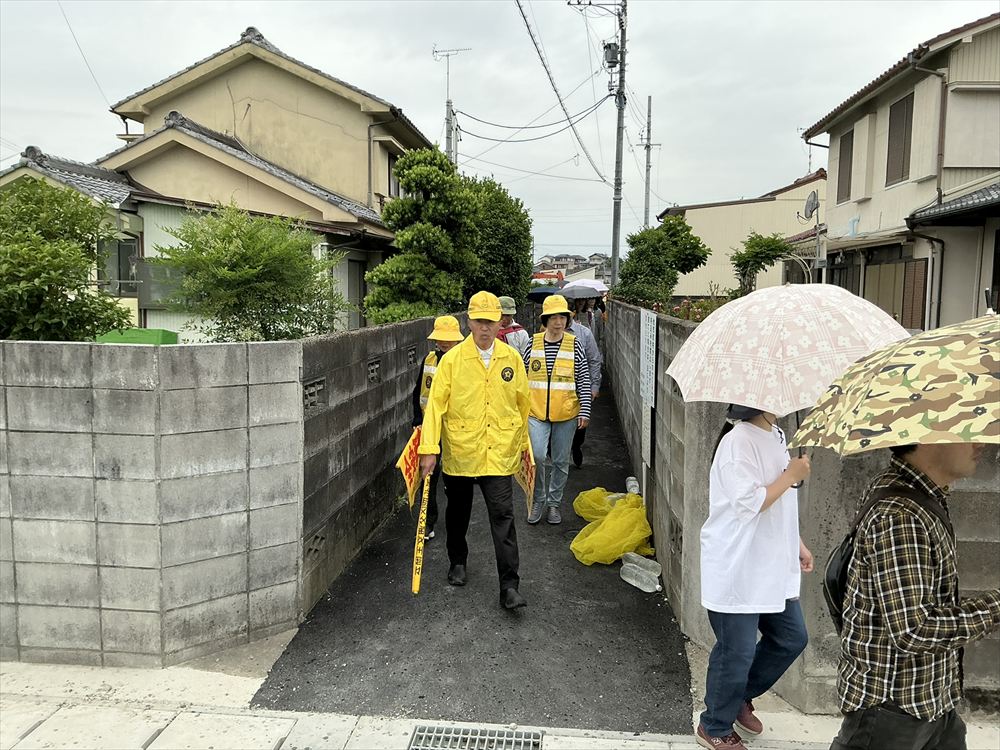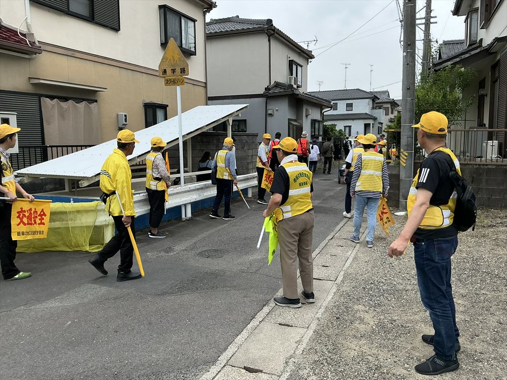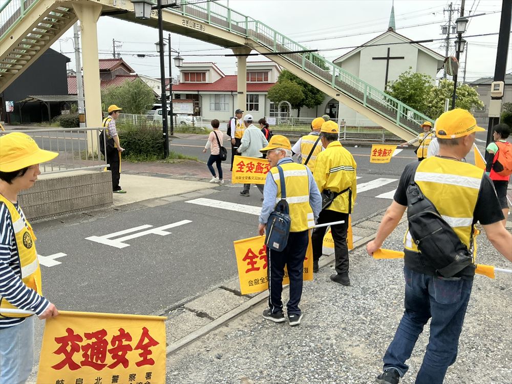 歩け歩け大会の道中では、岐阜北地区交通安全協会鷺山支部の皆さんが、交通安全の旗を掲げて見守りをしてくれました。