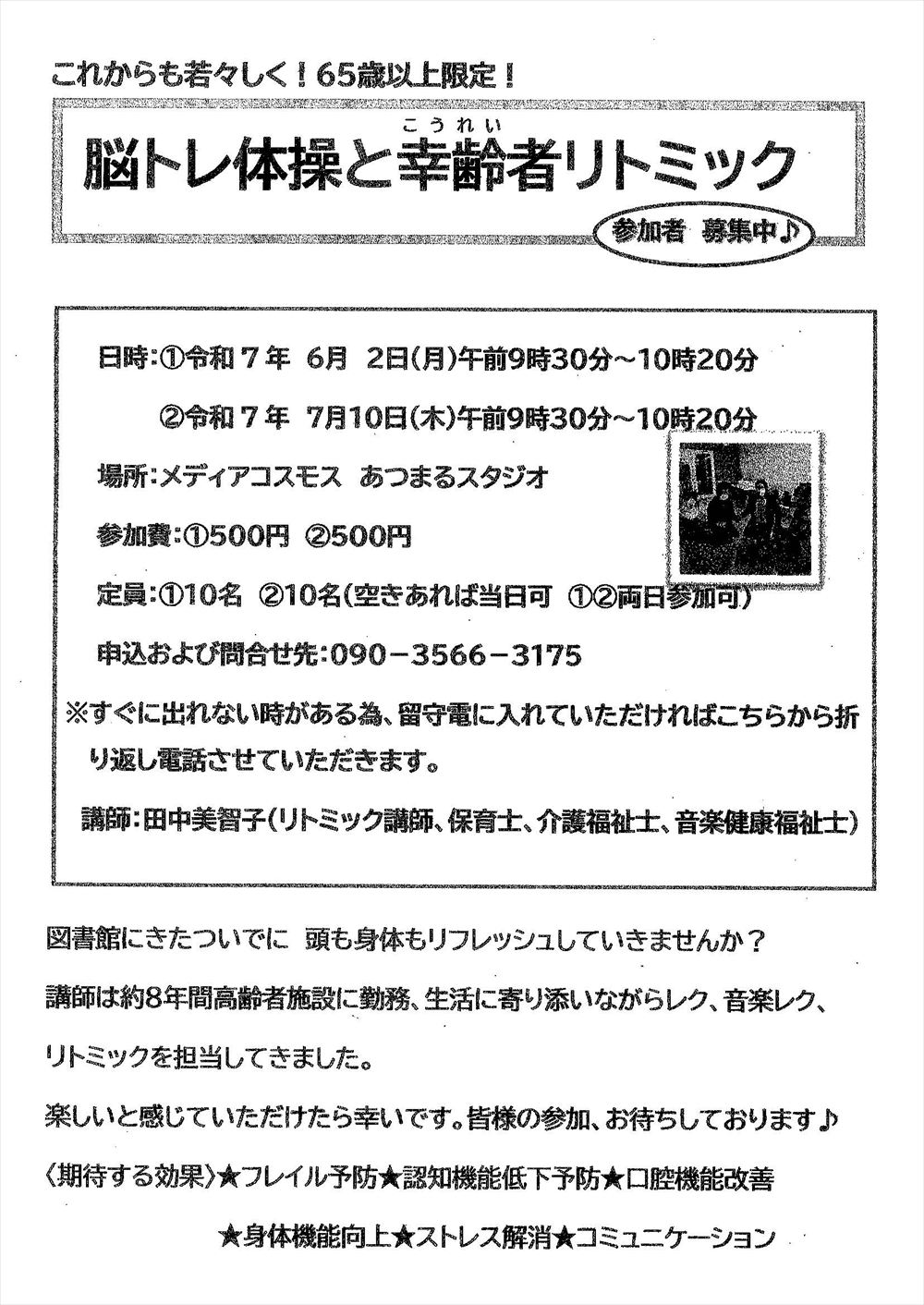 脳トレ体操と幸齢者リトミック(令和7年6月2日、7月10日開催)