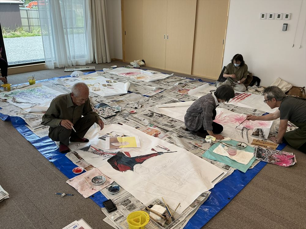 鷺山公民館クラブの水墨画クラブの皆さんが、鷺山公民館ホールにて、鷺山夏祭り大会に飾られる「大行灯・中行灯」の絵を描いてくださっています。