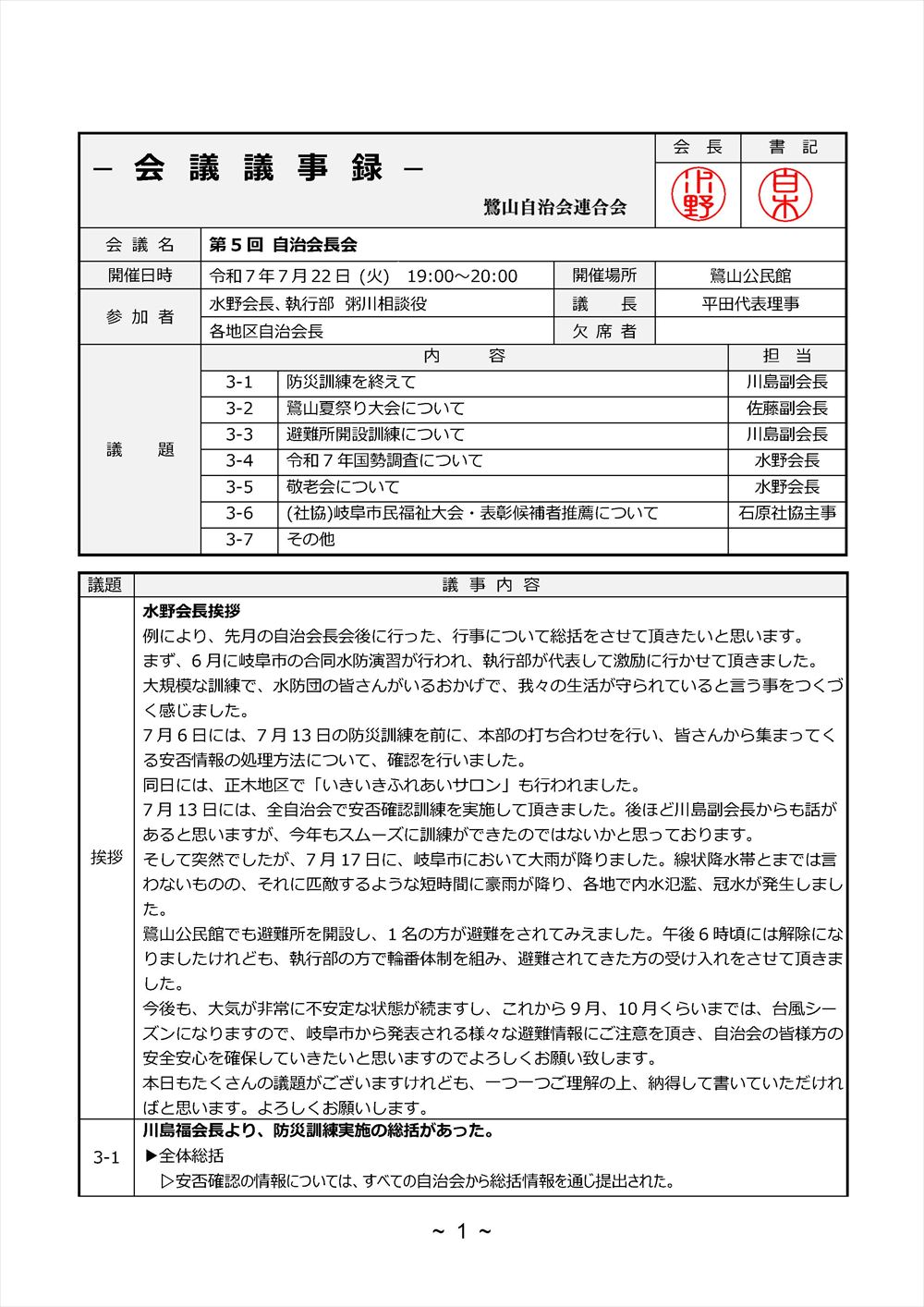 令和7年7月22日 自治会長会議 議事録