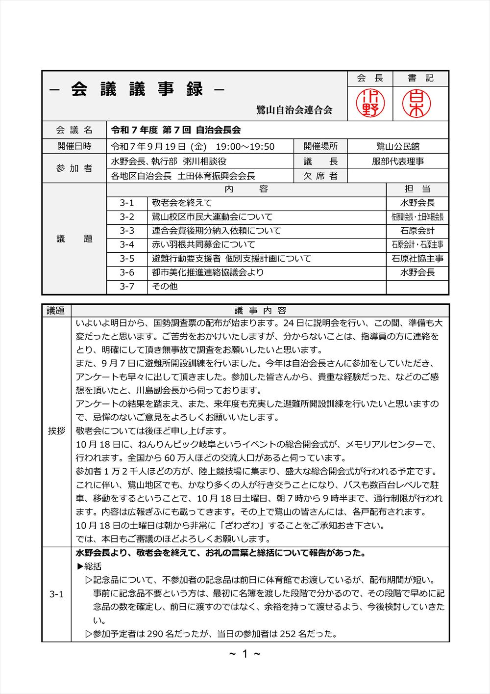 令和7年9月19日 自治会長会議 議事録