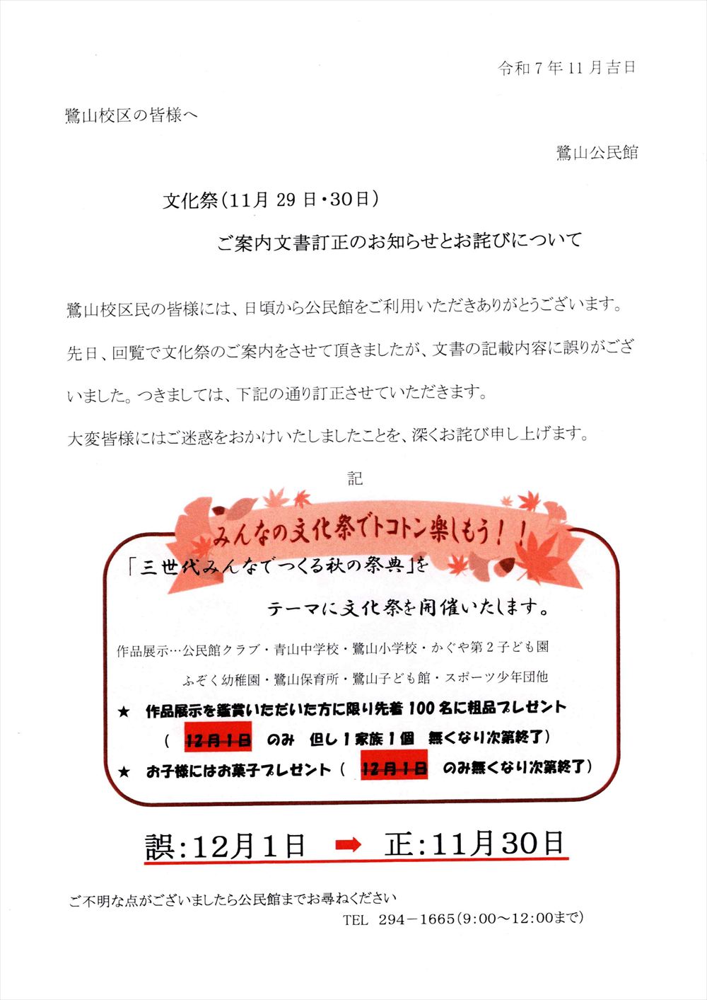 文化祭(11月29日、30日)ご案内文書訂正のお知らせとお詫びについて