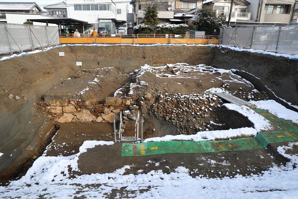 今回発見されたものは、鷺山の東側山麓に戦国時代に存在したと言われている館に関する石垣で護岸された土橋と堀の一部が確認されました。